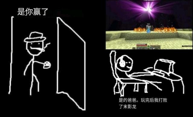 在mc中,什么事情会让你瞬间开心呢?这张梗图表达的这一幕可以说是最真实的一幕了,而且你或许就经历过。在mc中挑战末影龙是困难的,需要长时间的生存积累才能打败末影龙,而打败的这一刻便是最开心的时候。告诉父母,告诉朋友炫耀着自己打败了末影龙这个强大的生物。