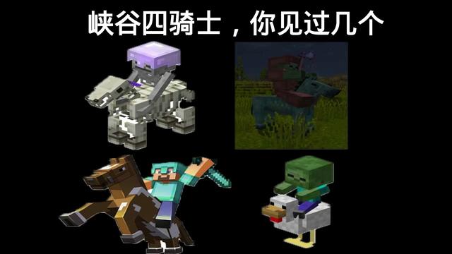 这张图片给我们展示了mc中的四骑士,骷髅骑士、鸡骑士、史蒂夫、僵尸骑士,不过这些生物都是特别少见的。需要在mc中玩足够长的时间才能够遇到的,那么你遇到过几个呢?