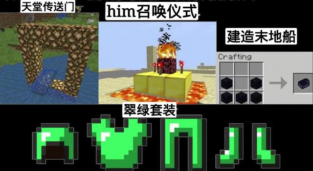 如果你在mc中接触传送门,那么你一定被天堂传送门骗过。萤石和水桶合成传送门,最后是满目狼藉。第二个经典谎言则是召唤him,一些火把金矿来建造祭坛,最后等来的不是him,而是空气。建造末地船则是玩家们也都尝试过的一件事,不过最后依旧是失败。第四个则是翠绿套装,一个存在于模组中的套装,曾经欺骗了无数玩家去尝试。虽然是谎言,但是这已经成为了mc萌新阶段都要经历的一件事,可以说是独有的特色了。