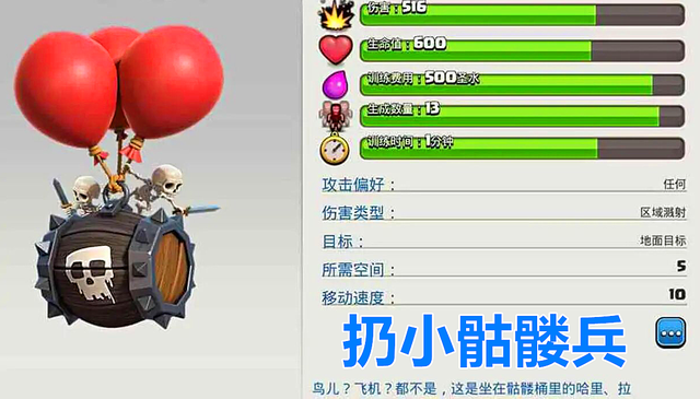 “骷髅飞桶”这个兵种在去年“万圣节”返场的时候,小白是真的没有玩明白,等到后期活动快要结束的时候,才发现这个兵种的清边能力还是很强的,并且所需要的空间也不大,如果这个兵种在今年返场,那么小伙伴们可以试试它和“龙骑士”的组合,一个负责打防御建筑,一个清边加收尾,这个流派应该很好玩,小伙伴们觉得呢?