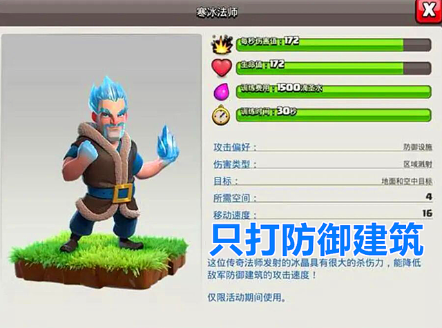 “寒冰法师”也是返场的老客户了,小白依稀记得这个货已经返场过很多次了,寒冰法师的特点就是只打防御建筑,并且还能降低防御建筑的攻速,这个设定还是比较不错的,但是和派对法师有一样都有一个致命的缺点,本身的血量还是太脆了,并且老是冲在大部队的前方,可玩性挺高的,就是强度不行,如果要投票的话,小白绝对不会选这两位法师。
