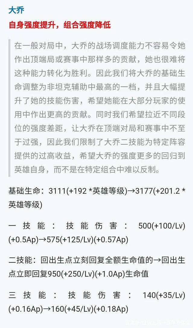 大乔本次略微增加了本身的生命值成长,增加了一三技能的伤害。这些调整肯定的正面的。