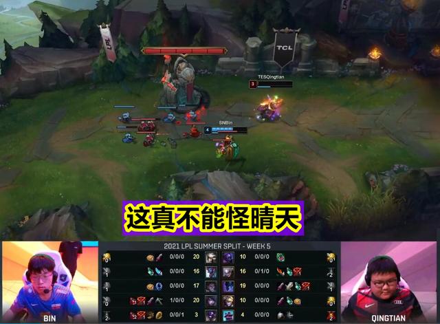 其次,要知道青钢影、武器这两个英雄可都是bin的绝活英雄,而TES这种用bin的一个绝活,去打他另一个绝活的BP的方式,其实本身就是一个错误的决定,bin不可能不知道青钢影如何去打武器,所以这也是为什么,晴天从前期就一直被青钢影碾压的原因。