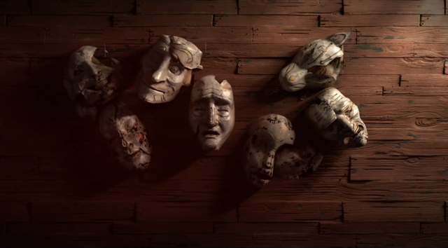 视频开头以面灵气的第一视角开头,讲述她在一间惊悚的宅子中游荡,看起来是在躲避些什么。之后镜头一转,画面切换到了散落的面具上面,并开始以这些面具的独白为主。如此一来,屏幕前的我们应该就能了解到,应该是这些面具的自言自语吓到了面灵气这位少女。这一点在视频最后也得到了确定,毕竟那一声让人汗毛竖立的惨叫简直把人魂都吓没了......