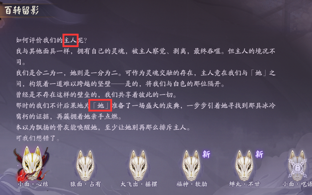 以小然我的个人脑洞来看,这次视频应该并非目前大部分玩家流传的那样“是少女面灵气进化成妖怪的故事”,相反或许是代表善良的白面与背负一切黑暗面的黑面之间的交流。目前正式服的百转流影活动,其实就在暗示这一点,黑面与白面的存在一直都是7个面具自言自语的谈资。