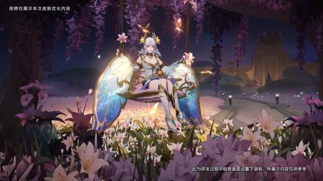 貂蝉-仲夏夜之梦的星传说皮肤“金色仲夏夜”也优化完成了,金色仲夏夜的出场动画比仲夏夜之梦好一点,背景的花园没有那么假了。在形象设计上,保留了原本的白金色调,把主要的装饰元素换成了百合花,背景的花园也是一片百合花海。