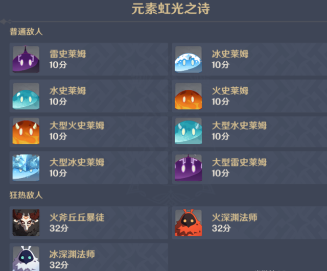 敌人配置以及刷新种类!首先还是来看看这关的敌人阵容,主要的敌人都是以各种元素的史莱姆为主,倒还是非常符合这关的名字的。第一波敌人是二十个不同属性的史莱姆,有五个火史莱姆,五个雷史莱姆,还有五个水史莱姆以及五个冰史莱姆组成,第一波的狂热敌人是一个火斧丘丘人暴徒。第二波的敌人是六个火史莱姆三个大型火史莱姆,一个水史莱姆两个大型水史莱姆,最后还有四个冰史莱姆。第二波的狂热敌人,是一个火深渊法师。第三波每次刷新,会出现两个雷史莱姆和两个大型雷史莱姆,三个火史莱姆和一个大型火史莱姆,六个冰史莱姆和两个大型冰史莱姆。狂热敌人是一个冰深渊法师。