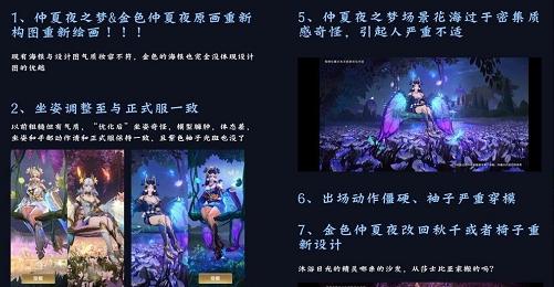 对于王者荣耀官方而言,玩家不满老皮肤的设计,从而重新翻新优化,这是肯定的。而貂蝉的仲夏夜之梦已经翻新优化了这么久,终于上架正式服。只可惜,还是引起广大玩家的不满,并且列出了8个应该优化的地方。其中,仲夏夜之梦和星传说的原画要重新制作,同时出场动画方面仲夏夜梦的坐姿应该跟正式服一致。最关键的一点,就是仲夏夜之梦的背景花海太多浓密,引起一些玩家不适。甚至,还有一些玩家选择退游明志,希望天美能够听取玩家的意见,重新设计这两款皮肤。