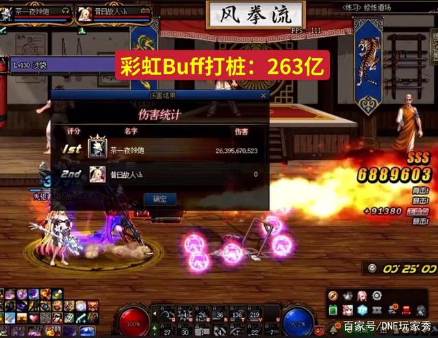 【1】第一轮打桩测试,茶哥猴戏白兔子,吃比赛规定药剂,然后有周年庆“彩虹Buff”,25秒伤害让人目瞪口呆,263亿,也就是改版前的26万亿。