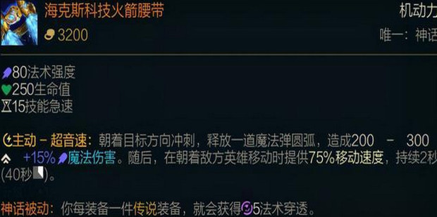 - 第一件装备选择海克斯科技火箭腰带,这件装备有个向前位置的主动技能,可以快速的靠近敌人,因为龙龟是个短手英雄,位移对龙龟比较重雷识要。