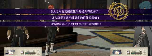 角色之间有一个支持设置,最高上限为S级,最低为B级。改善支援的好处会直接反馈到战斗中。当你攻击的目标在另一个角色(目前装备武器)的攻击范围内时,就会产生支援效果,一个角色最多可以被另外三个角色支援。