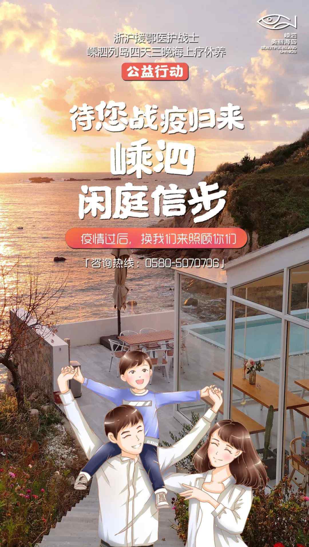 今天,盛载给大家最新的七张海报,是浙江上海一位帮助湖北的医护兵,在嵊泗列岛进行的四天三夜海上治疗疗养公益行动制作的!希望大家可以和朋友分享海报,让更多的浙沪医护兵知道这次为他们免费的公益行动!春天应该是好的,如果你在的话!浙沪援鄂医兵,当你从“疫情”大战归来,嵊泗会款款而行,我们会照顾你!