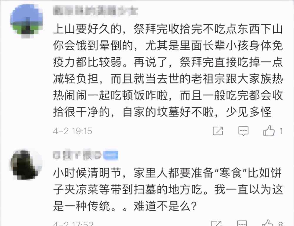 对此,有网友认为,上山祭扫时间长,需要补充能量,且“寒食”的传统由来已久。