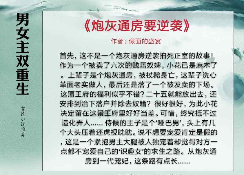 简评:一个安静的王子×一个彪悍的丫鬟,重生,前世无争。上一代的孩子是最喜欢的嫔妃,爬上床就被棍子打死,而男人是老实听话却被篡位皇帝处死的藩王。这一生,一个遵循生存法则,一个为生存做打算。当命运给了他们一份缘分,没有人比他们更懂得珍惜。由于童年的经历,王业几乎成了哑巴,治愈后,他非常安静。在过去的生活中,他被妻子拒绝了。他想一个人呆着,但最终还是被杀了。他重生回来,对妻子不理不睬,开始慢慢规划。伟大的太监为王子找到了另一个房间,最后离开了女主人小花。小华过去的生活是一场失败的家庭斗争,重生后她处处保持低调,但她仍然被卖到王宓当妾。报道没怎么关注女性,女主持人让报道更喜欢她一点。他们在一起生活了很多年,王爷成了皇帝。他们生了几个孩子,就去了后禅位自得其乐。强烈推荐!
