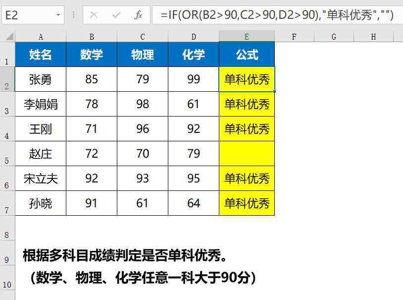 =中频(或(B2 >;90、C2 & gt;90、D2 & gt;90)、“单科优秀”、“”)