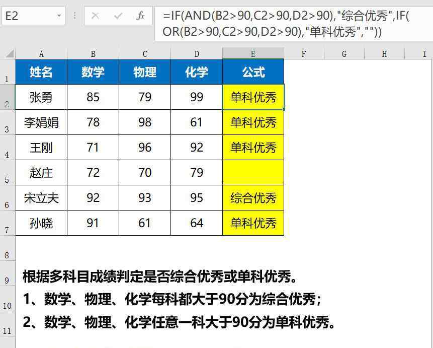 = IF(AND(B2 & gt;90、C2 & gt;90、D2 & gt;90),如果(或(B2 >: 90,C2 >;90、D2 & gt;90)、“单科优秀”、“))