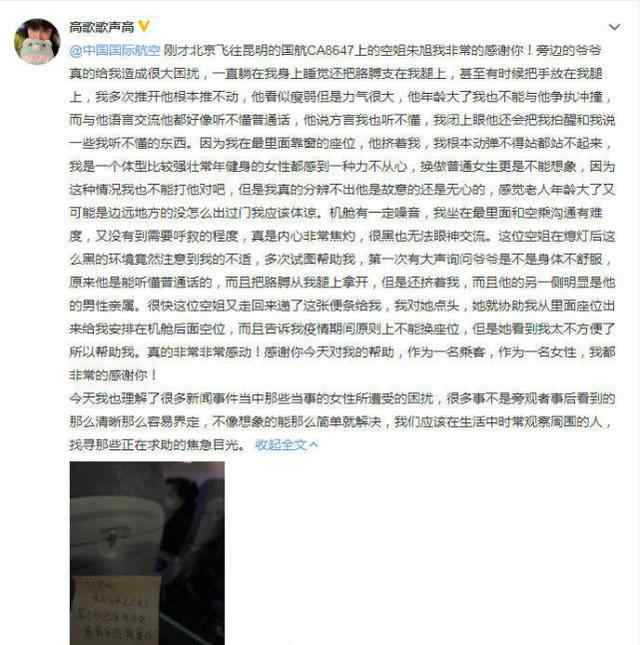 @中国国际航空刚才北京飞往昆明的国航CA8647上的空姐朱旭我非常的感谢你!旁边的爷爷真的给我造成很大困扰,一直躺在我身上睡觉还把胳膊支在我腿上,甚至有时候把手放在我腿上,我多次推开他根本推不动,他看似瘦弱但是力气很大,他年龄大了我也不能与他争执冲撞,而与他语言交流他都好像听不懂普通话,他说方言我也听不懂,我闭上眼他还会把我拍醒和我说一些我听不懂的东西。因为我在最里面靠窗的座位,他挤着我,我根本动弹不得站都站不起来,我是一个体型比较强壮常年健身的女性都感到一种力不从心,换做普通女生更是不能想象,因为这种情况我也不能打他对吧,但是我真的分辨不出他是故意的还是无心的,感觉老人年龄大了又可能是边远地方的没怎么出过门我应该体谅。机舱有一定噪音,我坐在最里面和空乘沟通有难度,又没有到需要呼救的程度,真是内心非常焦灼,很黑也无法眼神交流。这位空姐在熄灯后这么黑的环境竟然注意到我的不适,多次试图帮助我,第一次有大声询问爷爷是不是身体不舒服,原来他是能听懂普通话的,而且把胳膊从我腿上拿开,但是还挤着我,而且他的另一侧明显是他的男性亲属。很快这位空姐又走回来递了这张便条给我,我对她点头,她就协助我从里面座位出来给我安排在机舱后面空位,而且告诉我疫情期间原则上不能换座位,但是她看到我太不方便了所以帮助我。真的非常非常感动!感谢你今天对我的帮助,作为一名乘客,作为一名女性,我都非常的感谢你!