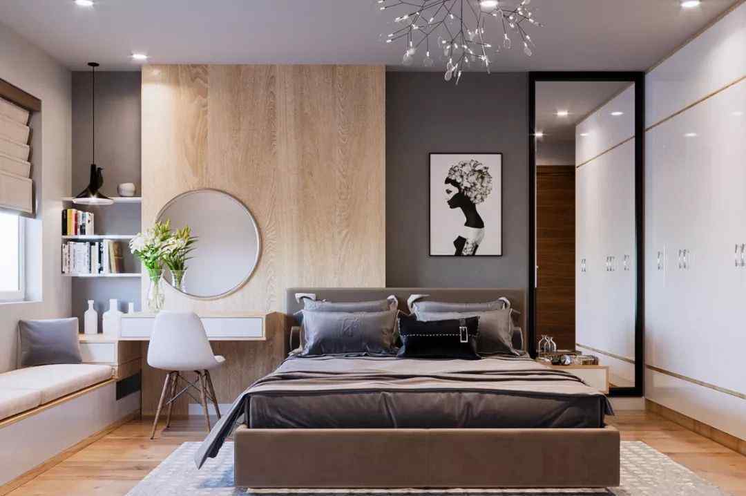 卧室小只能放下衣柜怎么办?然后结合衣柜,设计出一体的梳妆台!一张高价值的小梳妆台,结合顶部的衣柜,充分利用空房间,同时让卧室更有整体感。