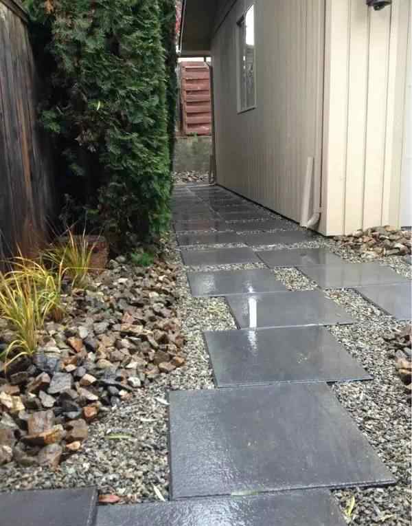 普通的青砖红砖也是很好的材料。它们价格便宜,可以创造出古朴的风格,可以随意摆放很多造型。另一个好特点:它们吸水性强。下雨时,雨水很快渗透到砖块下。雨一停,走道很快就干了,主人在走道里连脚都不会湿。