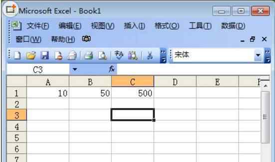 ③现在我们在单元格A1和B1中输入要相乘的数据进行求积。如下所示,我在单元格A1和B1中输入10和50进行乘法运算,结果将显示在C1,等于500。