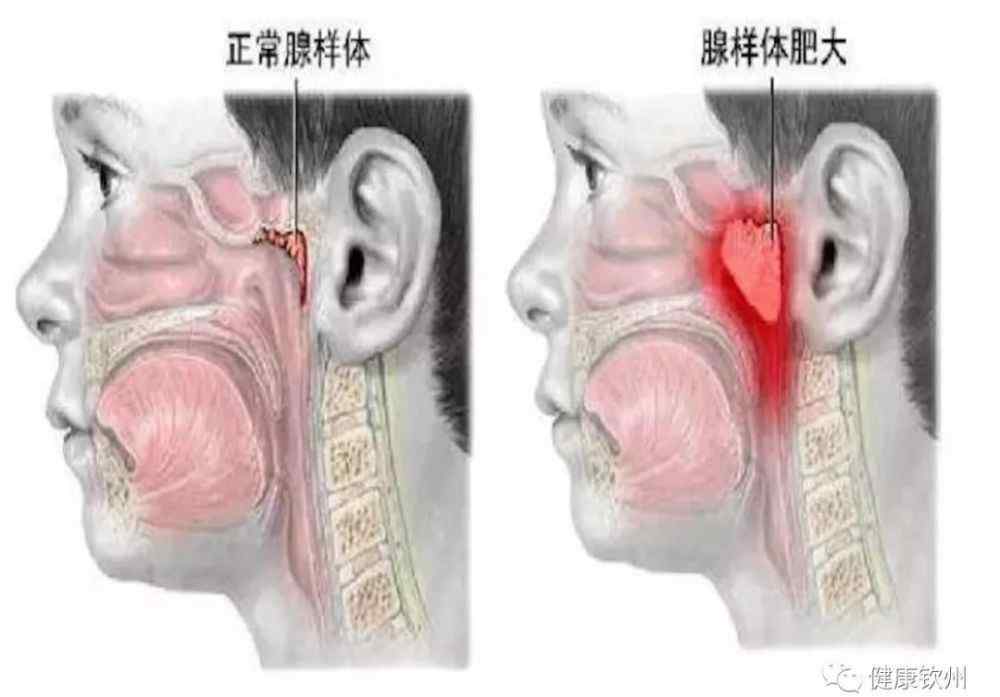 腺样体位于鼻腔后方,鼻咽顶壁和后壁的交界处,两侧为咽鼓管咽口,下方为口咽。一般腺样体在3岁左右逐渐增大,6-7岁达到高峰,所以腺样体肥大多表现在儿童身上。当腺样体肥大堵塞后鼻孔时,鼻腔通气受到影响,儿童会出现鼻塞、张口呼吸、睡觉时打鼾等症状。