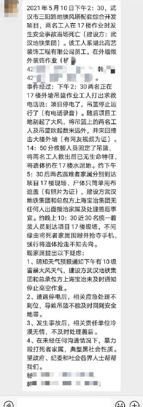事发后,遇难工人杨某和韩某的家属在网络上发文:遇难工人系湖北高艺装饰工程有限公司员工,在外墙做外装饰作业。5月10日下午2时30分,两名工人打出求救电话提到,项目停电,吊篮停止运行。下午2时50分,救援人员固定吊篮,将两名工人救出后发现已无生命特征,将遗体扔在17楼水泥地。下午5时30分,两工人的家属分别到达项目17楼现场,建设方武汉地铁集团和总包方上海宝冶集团无任何人出面接洽。