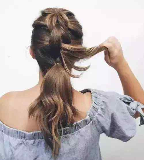 第二步:用橡皮筋固定马尾辫,然后轻轻提起头顶的头发,使蓬松的效果更加明显。可以配一个简单的发夹,也可以配一个漂亮的发圈。在扎头发的位置盖上橡皮筋会更美观。
