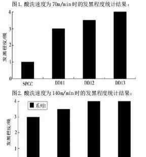 图1和图2显示了四种钢种在不同速度酸洗后表面发黑的统计数据。