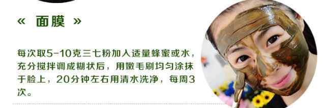三七对气滞血瘀引起的斑有很好的作用,也利用了其活血作用。每天用温水或牛奶服用三七3-5g,也可加蜂蜜以适应苦味,对祛斑有辅助作用。