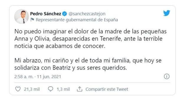 整个西班牙都在“屏住呼吸“密切关注着发生在这个岛屿如此令人心碎的案件,西班牙首相桑切斯在社交媒体发出了声援家庭的信息并表示:我无法想象在特内里费岛失踪的Olivia和Anna的母亲在面对我们刚刚得到的可怕消息时所遭受的痛苦,我和我全家今天声援Beatriz。