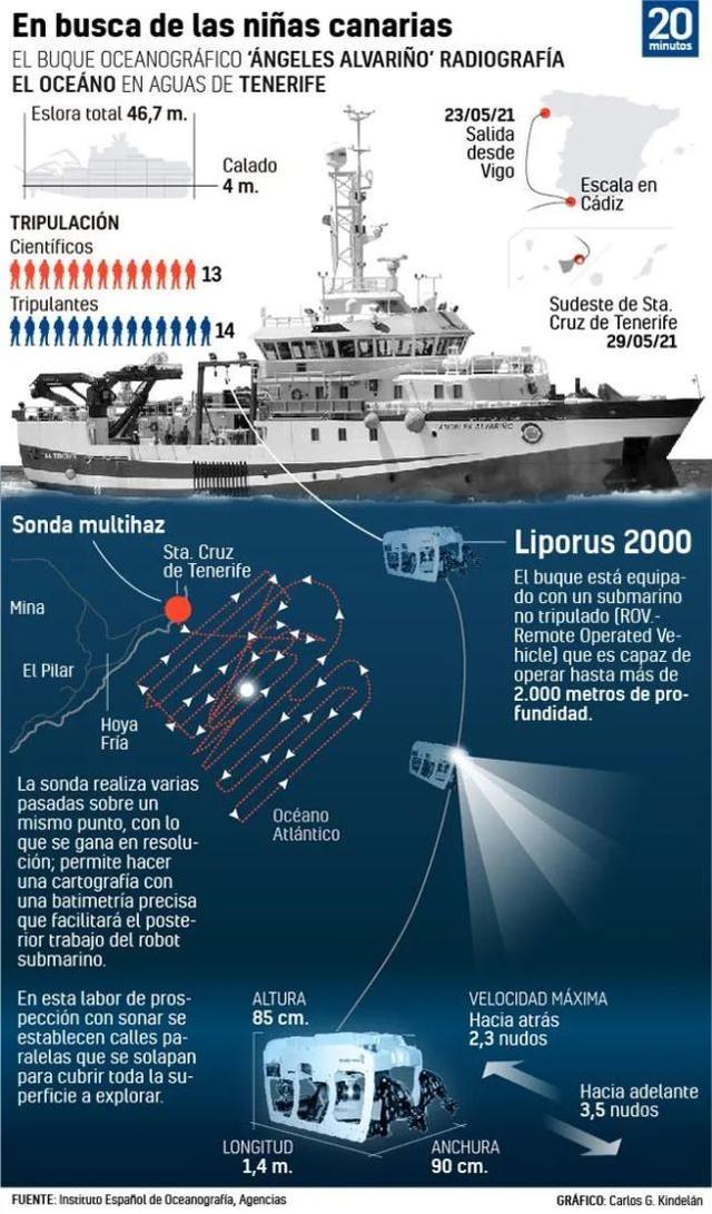 5月17-23日:民防总局局长María Gámez报告说,将一个声纳系统和一个水下机器人纳入搜索范围,这艘远洋船配备声纳和水下机器人,能够在2 000米深度作业。