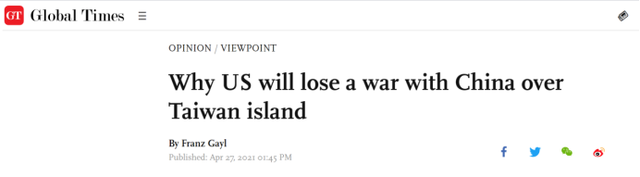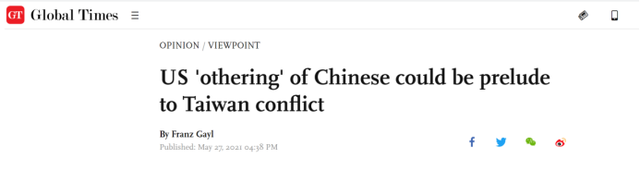 不过,报道说,盖尔对这些批评不屑一顾,甚至一个月后再在环球时报发表了另一篇文章:“美国‘他者化’中国人可能是台海冲突的前奏”。