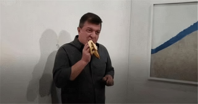 并且他的嘴里津津有味地嚼着什么,直到他再次咬了一口手中的香蕉,人们这才反应过来,这名游客竟然将一件价值85万的“艺术品”吃掉了!