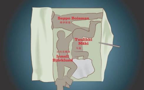 我们看下当时的案发场景,首先是被害人马基。她的头被一块毯子盖住,头部靠近比约克隆德右腿膝盖的位置,身体蜷缩,两腿弯曲。
