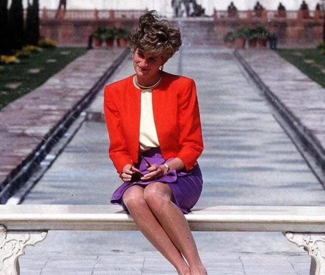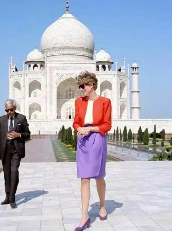 1992年2月11日,戴安娜穿着一身橘红色外套、紫色短裙游玩泰姬陵。柔和的建筑线条和戴安娜的优雅是那么的搭配,游玩片刻后只见戴安娜坐在一条长椅上休息,肩膀微微内合,略微低头好像思考、回忆什么事,看起来非常孤单。这张长椅后来也被称为“戴安娜之椅”。