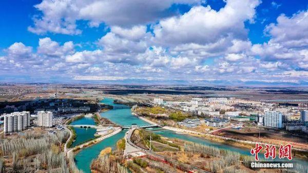 ▲航拍春雨后的新疆博湖县城,蓝天、白云、碧水与河边芦苇交相辉映。(中新网资料图片)