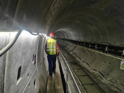 下午掘进开始前,王维强要指导同事管片拼装技术,检查拼装质量,查看盾尾间隙,各方面综合考虑,然后确定下一步推进姿态的调整。检查壁后回填情况:成型管片壁后要吹填豆砾石和水泥浆,以使管片和岩层完全贴合,避免出现管片移位,王维强正在检查壁后回填情况,确定下一步工作。