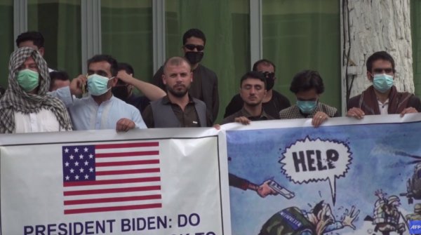 “拜登总统,请不要对我们置之不理”抗议的阿富汗翻译举出横幅 法新社视频截图