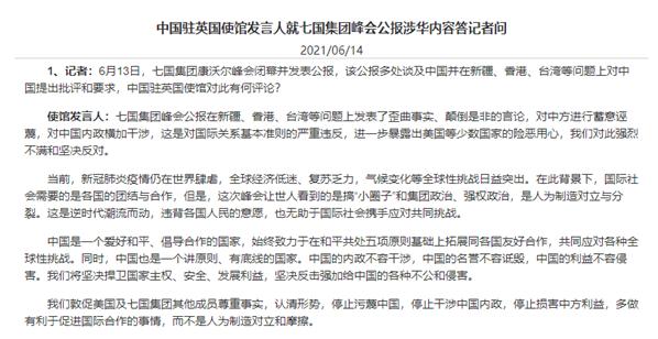 而在七国集团领导人发布公告就所谓的“新疆地区的人权问题”指责中国,并要求对毫无根据的“中国实验室是否泄漏新冠病毒”这一莫名的问题进行全面、彻底的调查后,中国驻英国使馆发言人重磅发声,回击美国及七国集团。