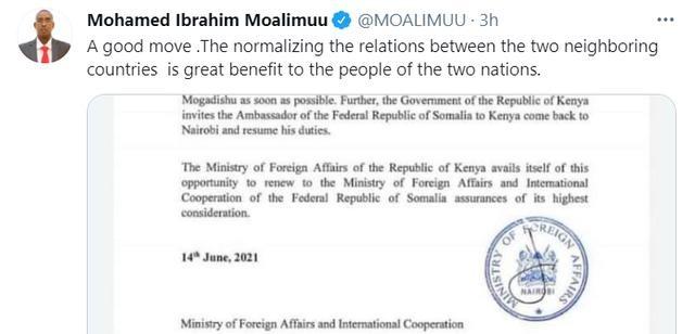 当地时间6月14日,肯尼亚政府宣布将尽快重开其在索马里首都摩加迪沙的大使馆。肯外交部同时邀请索马里驻肯尼亚大使返回内罗毕。索马里政府新闻发言人穆罕默德·易卜拉欣对此表示欢迎,并表示这符合两国和两国人民的利益。