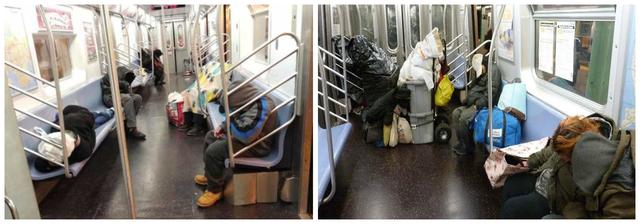 过了午夜,车厢就成了流浪汉的天下,他们会大包小包带上这一整天的战利品……纽约地铁曾经考虑过禁止乘客在地铁上饮食,后又倡导乘客不要在地铁上乱丢垃圾,但都雷声大雨点小,没了下文。