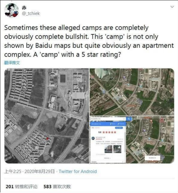 由于人们能在百度地图上给地点评分,而阳光锦绣小区还是“五星”小区。为此这位网友也指出:“很明显有时候这些所谓的‘集中营’就是完全胡扯。这处‘集中营’不仅在百度地图上清晰可见,是一处住宅区。一个带有‘5星好评’的‘集中营’?”