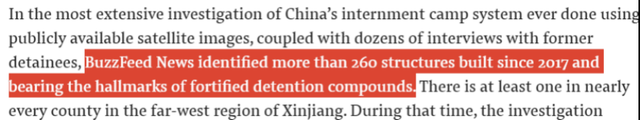 能够看到,其对于“集中营”话题,最主要的新闻来源是百度地图上的卫星图片。BuzzFeed声称,他们用这些卫星图片,在中国新疆找到了超过260个从2017年开始修建的“拘留集中营”。260个是什么概念呢?BuzzFeed不忘给他们的读者“科普”:基本相当于新疆每个县都有。除了文字,该报道还给出了一些图片。乍一看,似乎挺像回事。
