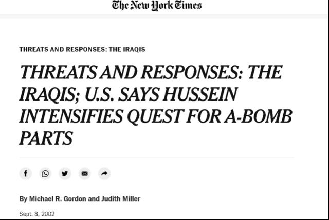 根据《环球时报》,当年为美国政府在媒体上撒谎,称伊拉克有大规模杀伤性武器,令美国顺利入侵了伊拉克的《纽约时报》前记者朱迪斯·米勒(Judith Miller),在编造出这一伊拉克假新闻的前一年,因为对中东地区反美恐怖主义的系列报道而获得了普利策奖。