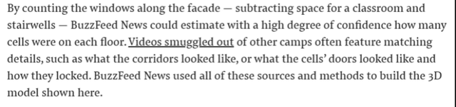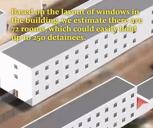 记者在报道中写道:“通过计算立面上的窗户数量——BuzzFeed News可以很有把握地估计出每层楼有多少个牢房。从其他‘集中营’流传出的视频,通常都有相应细节,比如走廊是什么样子的,牢房的门是什么样子的……BuzzFeed News使用了所有这些来源和方法来构建这里显示的3D模型。”