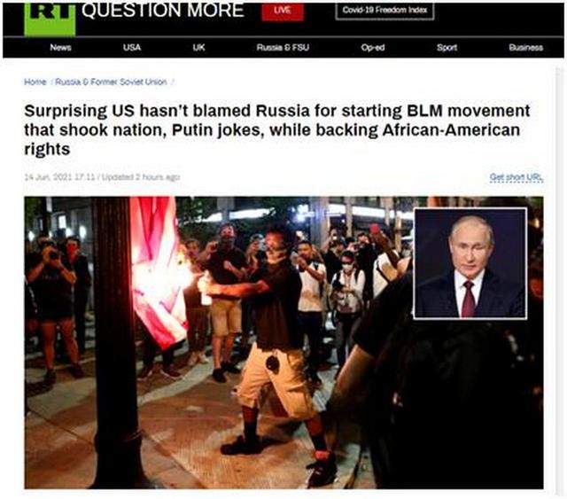 RT:在支持非裔美国人权利的同时,普京开玩笑说对美国没有指责俄罗斯发起震惊全美的BLM运动表示惊讶