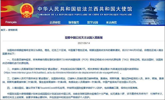 中国驻法国大使馆提醒计划来法或回国后计划返法的中国公民,当前全球新冠肺炎疫情仍十分严峻,如无紧急必要,请尽量避免跨境旅行,如确需来法,请密切关注上述政策,按要求准备必要材料,并在旅途中和抵法后严格做好个人防护。