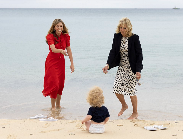 而且,当她们一同去沙滩玩耍时,还有网友调侃凯莉的一岁儿子小约翰的鸡窝头看起来与吉尔一模一样,他金发碧眼的模样实在是太萌了。