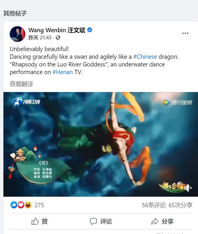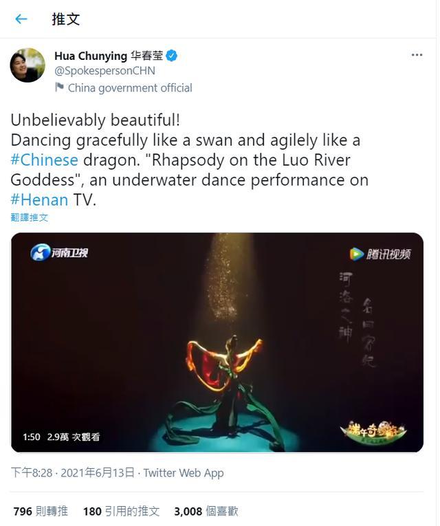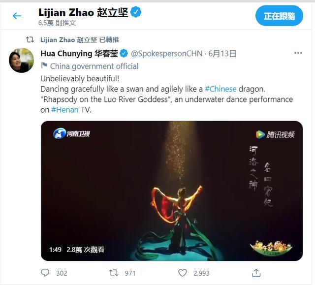 6月13日晚,外交部发言人华春莹在推特发文点赞水下舞蹈《洛神水赋》,这则推文收获了很多国际网友的回应和喜爱。稍后,汪文斌也在Facebook个人账号上发出了同样的内容。还有,赵立坚也使用个人推特转发了华春莹点赞《洛神水赋》的推文!