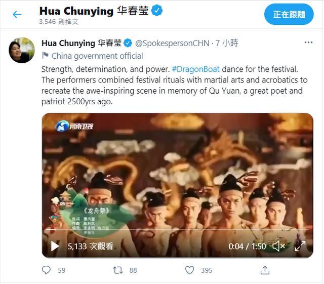 6月14日下午,华春莹再次发推,向全球网友推介《端午奇妙游》的另一个节目《龙舟祭》!华春莹说: